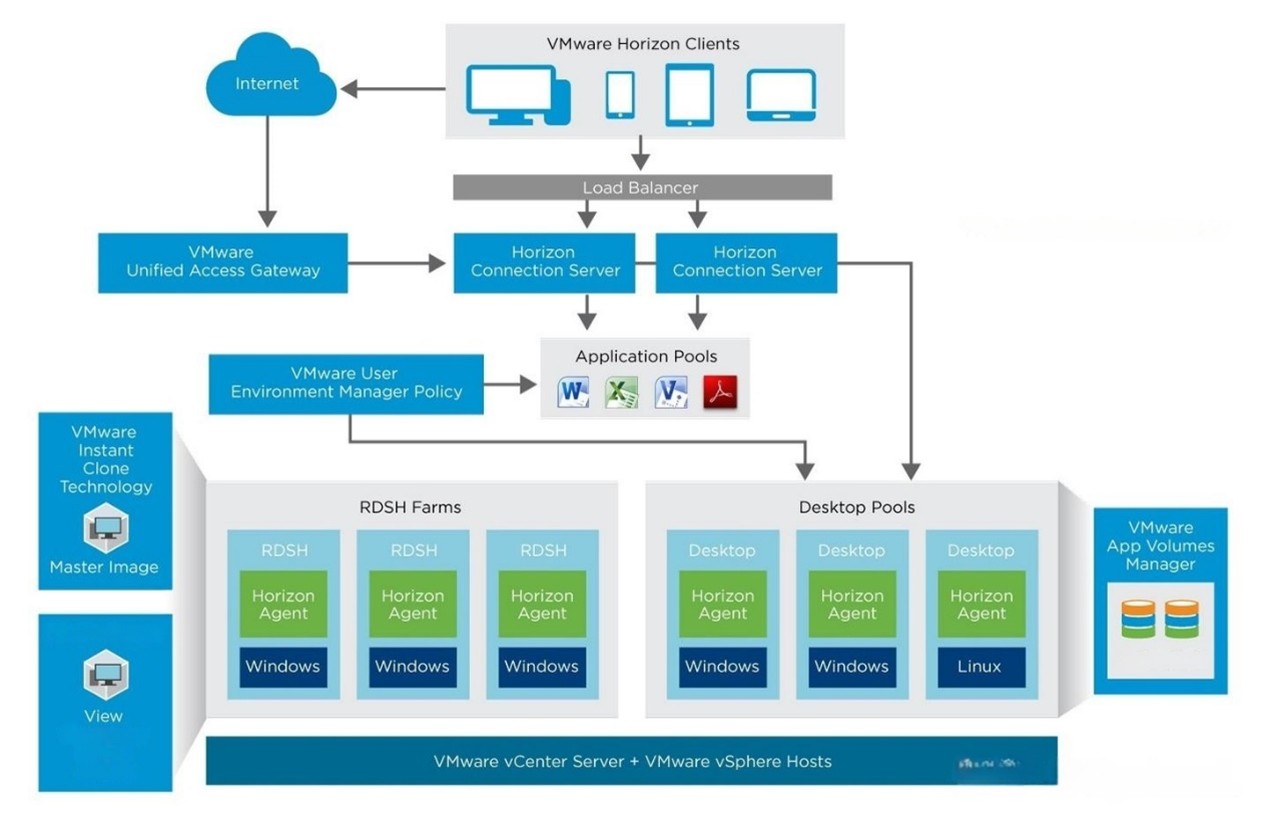 VMware Horizon 是一款企业级桌面虚拟化(VDI)和应用交付解决方案,专为现代化办公环境设计。Horizon可以通过单一平台向终端用户交付虚拟化或托管桌面和应用。可借助一个数字化工作空间,通过任意设备、利用任意介质和网络连接、从任意位置随意访 问这些桌面和应用服务。